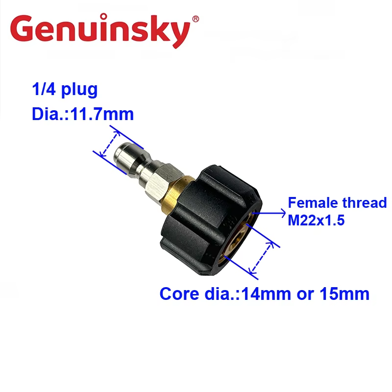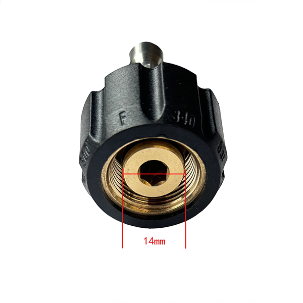 Questo prodotto è una spina rapida da 1/4 di pollice. Il diametro della spina rapida è di 11,7 m e l'altra estremità è thread femminile M22 × 1.5. Ci sono due diametri di fori tra cui scegliere, Core Dia.14 mm o 15 mm. È ampiamente utilizzato in molti scenari di pulizia ad alta pressione nella società moderna.