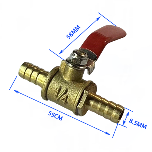 2. Modello a doppia pagoda, il diametro del connettore su entrambe le estremità è 8,5 mm, la lunghezza totale del corpo valvola è 55 mm e la lunghezza della maniglia è 58 mm. È possibile inserire direttamente il tubo dell'utensile pneumatico senza ulteriore assistenza articolare.