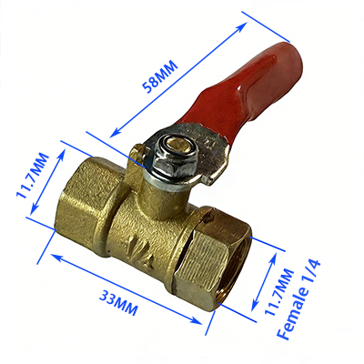 4. Tipo con doppia filettatura interna, entrambe le estremità sono filettate femmina 1/4, il diametro è 11,7 mm, la lunghezza totale del corpo valvola è 33 mm e la lunghezza della maniglia è 58 mm, che può essere adattata all'aggancio della tubazione dello stretto spazio interno dell'apparecchiatura.