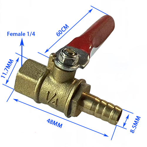 5. Filettatura femmina + modello pagoda, un'estremità del prodotto è filettatura femmina 1/4, con un diametro di 11,7 mm e l'altra estremità è una testa a pagoda da 8,5 mm, la lunghezza totale del corpo valvola è 48 mm e la lunghezza della maniglia è 60 mm, che è adatta principalmente per l'interfaccia con filettatura interna del compressore d'aria e il trasferimento del tubo.