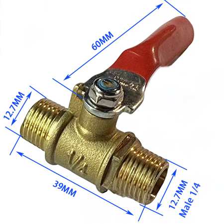 6. Modello a doppia filettatura esterna, le estremità del prodotto sono filettatura maschio 1/4, il diametro è 12,7 mm, la lunghezza totale del corpo valvola è 39 mm e la lunghezza della maniglia è 60 mm, che viene utilizzata principalmente per l'aggancio del tubo rigido del circuito principale del compressore d'aria.