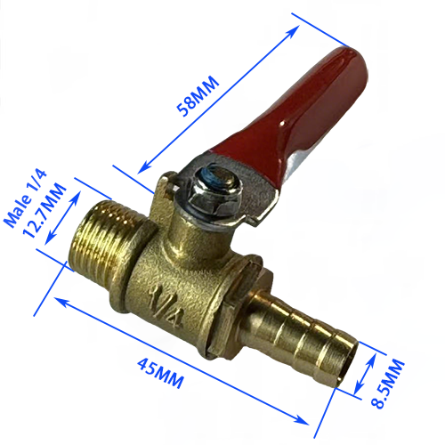 3. Filettatura maschio + modello pagoda, un'estremità del prodotto è filettatura maschio 1/4, con un diametro di 12,7 mm e l'altra estremità è una testa a pagoda da 8,5 mm, la lunghezza totale del corpo della valvola è 45 mm e la lunghezza della maniglia è 58 mm, adatta per il trasferimento di tubi rigidi e flessibili, utilizzati principalmente per la conduttura di compressori d'aria e utensili pneumatici. Collegare.