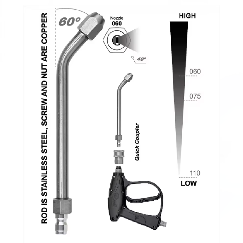 Il design dimensionale di questo ugello piegato è accurato, piegato a 60 gradi, con il design del foro di uscita Dia.060 40 gradi, questo speciale design d'angolo può facilmente raggiungere lo spazio interno stretto del condizionatore d'aria per la pulizia. L'operazione può essere molto flessibile. La specifica dell'ugello è 060 e l'angolo dell'ugello è di 40 gradi, quindi può formare un flusso d'acqua appropriato per il lavaggio nell'operazione di pulizia. Nilfisk e WAP sono marchi molto famosi di attrezzature per la pulizia. Queste due marche di pistola da lavaggio hanno un flusso d'acqua ad alta pressione stabile e possono controllare accuratamente la pulizia, quindi sono ampiamente utilizzati nel lavoro di pulizia in molti scenari. L'ugello piegato di Guininsky si adatta alla pistola WAP/Nilfisk, in modo che possa pulire comodamente il condizionatore d'aria con la cooperazione di entrambe le parti e può pulire la polvere e lo sporco all'interno del condizionatore d'aria in modo più efficiente. La pulizia puntuale del condizionatore d'aria non è solo per le persone, ma può anche estendere la durata del condizionatore stesso.