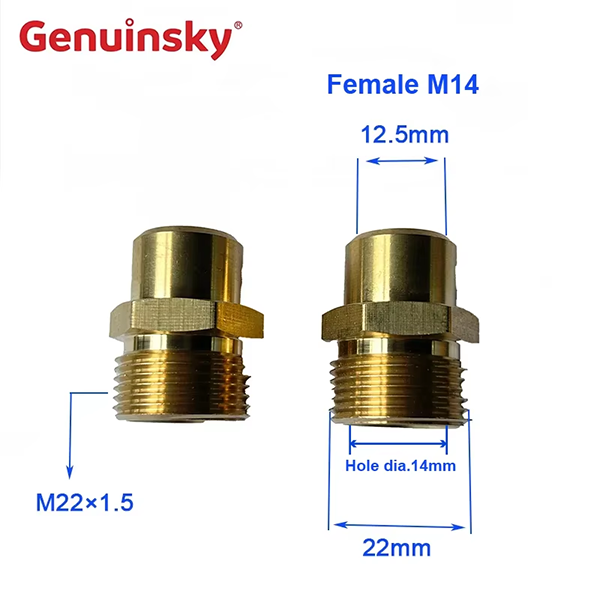 Raccordi per tubi in ottone adatto per l'attrezzatura per lavaggio per auto ad alta pressione. Prima di tutto, iniziamo con le dimensioni del prodotto stesso. Un'estremità è filo maschio M22 × 1,5, con un diametro di 22 mm e un foro dia.14 mm. All'altra estremità c'è il filo femminile M14, con un diametro di 12,5 mm. Può essere utilizzato con macchine per la pulizia ad alta pressione adatte in base alle esigenze.
