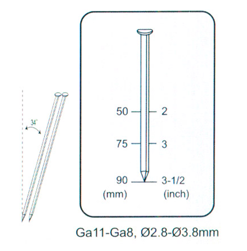 Le specifiche per unghie sono GA11-GA8, con diametro 2,8-3,8 mm e lunghezze in genere da 50 mm, 75 mm e 90 mm (2 pollici, 3 pollici, 3-1/2 pollici). L'angolo di inclinazione della disposizione delle unghie è di 34 gradi. La profondità delle unghie può essere regolata in base alle esigenze di lavoro.