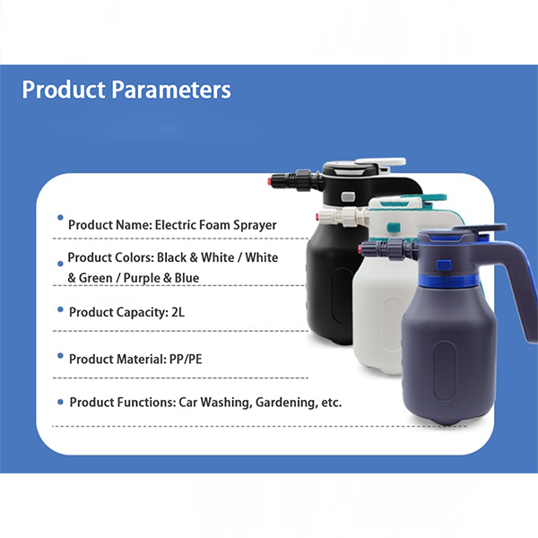 Gli stessi prodotti spruzzatori di schiuma elettrici presentano molti vantaggi. Innanzitutto, la sovralimentazione elettrica, la spruzzatura con un clic. Il sistema di sovralimentazione elettrica fa sì che il lavoro di irrorazione possa essere realizzato con una leggera pressa. Che si tratti di innaffiare fiori e piante nel giardinaggio, di produrre schiuma pulita nella pulizia dell'auto o di disinfettare e pulire in casa, la sovralimentazione elettrica può consentire agli utenti di spruzzare in modo uniforme con un clic sul lavoro, facendo risparmiare tempo e fatica e migliorando l'efficienza del lavoro. La pressatura manuale richiede pressature ripetute, il che non solo è faticoso, ma riduce anche l'efficienza del lavoro. In secondo luogo, la durata della batteria è più lunga e può essere utilizzata per circa 30-45 minuti con una singola carica. Questa resistenza può essere utilizzata senza interruzioni durante il processo di lavoro e può completare contemporaneamente il giardinaggio, l'irrigazione o la pulizia dell'auto, il che è utile anche per migliorare l'efficienza. In terzo luogo, la forte pressione elettrica del prodotto può emulsionare completamente il detergente o il disinfettante e la schiuma prodotta è più densa. Nella pulizia estetica dell'auto, la schiuma densa può penetrare più in profondità nelle fessure della vernice dell'auto, rendendo lo sporco più facilmente disintegrabile. Nei lavori di irrigazione orticola, se la soluzione nutritiva è schiumosa, può essere più facile il contatto con le piante. Allo stesso tempo, viene spruzzato con un ampio angolo per farlo entrare completamente in contatto con le piante. Infine, durante la disinfezione e la pulizia della casa, la schiuma più delicata fa sì che l'area di contatto possa essere ampliata, rendendo il lavoro di disinfezione e pulizia più approfondito. Rispetto al tradizionale spruzzatore pressato a mano, la pressione manuale insufficiente fa sì che la schiuma sia scarsa e irregolare, il che influisce notevolmente sull'effetto di pulizia e disinfezione. In quarto luogo, ispessire il corpo della bottiglia e migliorare il materiale, in modo che gli utenti possano usarlo più a proprio agio. Il prodotto stesso è realizzato in materiale PP/PE per creare un corpo della bottiglia più spesso. L'ispessimento del corpo della bottiglia rende lo spruzzatore di schiuma elettrico più durevole e non soggetto a danni. Infine, i dettagli di progettazione delle parti funzionali del prodotto sono più professionali e umanizzati. Ad esempio, la porta di ricarica di tipo C può essere compatibile con i dispositivi di ricarica tradizionali, rendendo la ricarica più comoda. La valvola limitatrice di pressione può garantire la sicurezza d'uso e l'ugello in schiuma può controllare accuratamente il raggio di spruzzatura, che può facilmente completare la spruzzatura grandangolare e la spruzzatura a punto fisso.