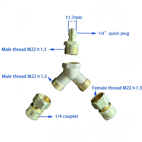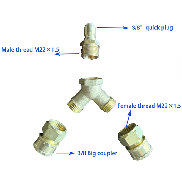 Esistono due modelli, il primo è un connettore a tre vie con accoppiatori da 1/4 "e 2 pcs 1/4". Un'estremità del tappo da 1/4 "ha una rapida progettazione di spina con un diametro di 11,7 mm e l'altra estremità è il filo maschile M22 × 1,5. Un'estremità dei due giunti da 1/4" è il filo femminile M22 × 1,5 e l'altra estremità è 1/4 coeler. Il secondo è un connettore a tre vie con plug da 3/8 "e 2pcs da 3/8". Il materiale è pieno di rame, che ha una buona resistenza alla corrosione e può mantenere una connessione stabile nel complesso ambiente di lavaggio delle auto. Allo stesso tempo, il rame ha anche una certa resistenza e un'eccellente duttilità, che è una scelta affidabile per gli ambienti di pulizia ad alta pressione. La dimensione di 1/4 di pollice può essere adattata in modo flessibile a lavatrici per auto, pistole a spruzzo e altre attrezzature. Le specifiche da 3/8 pollici possono essere applicate all'uso di un flusso più grande, come la pulizia di veicoli di grandi dimensioni o le attrezzature industriali di pulizia, che migliora significativamente l'efficienza della pulizia.