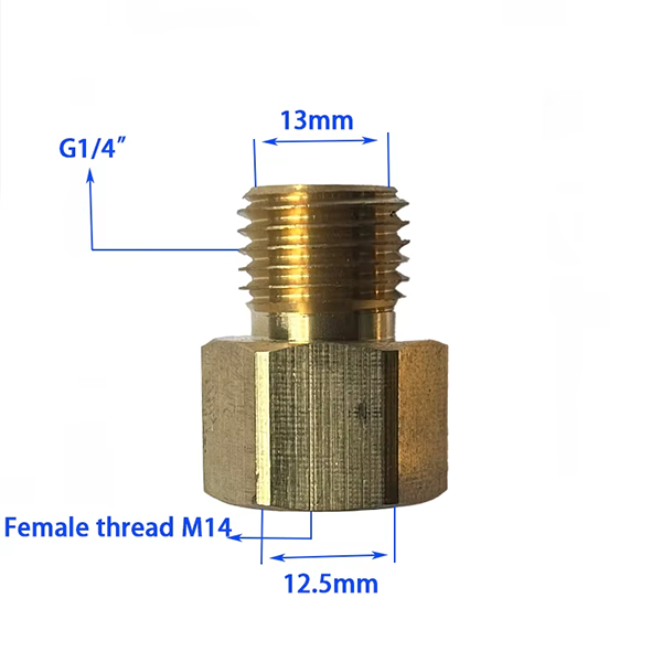 La dimensione del prodotto stesso è rigorosamente progettata in base alla dimensione corrispondente. Ci sono due specifiche tra cui scegliere. Il primo tipo di nipplo, un'estremità è G1/4 pollici, con un diametro di 13 mm, e l'altra estremità è una filettatura femmina M14×1,5, con un diametro di 12,5 mm. Il secondo tipo di nipplo, un'estremità è con filettatura maschio M14, con un diametro di 14 mm, e l'altra estremità è con filettatura femmina M14×1,5, con un diametro di 12,5 mm, con un design a cono interno. Il design del cono interno può essere strettamente abbinato alla superficie conica del giunto corrispondente per formare nuovamente una tenuta secondaria, in modo che la tenuta e la resistenza alla pressione della connessione possano essere notevolmente migliorate. Il nipplo in ottone conico da M14x1,5 femmina a M14 maschio è un materiale in ottone con forte resistenza alla corrosione e alla pressione. Il trasporto di fluidi richiede un ambiente umido a lungo termine ed è soggetto a reazioni chimiche. Pertanto, le caratteristiche del materiale in ottone possono mantenerlo stabile e non facile da arrugginire e rompersi, il che influisce sull'intero flusso di lavoro. Inoltre, prolunga la durata del prodotto stesso e riduce i costi di sostituzione dell'apparecchiatura.