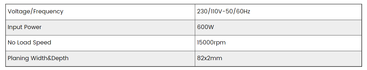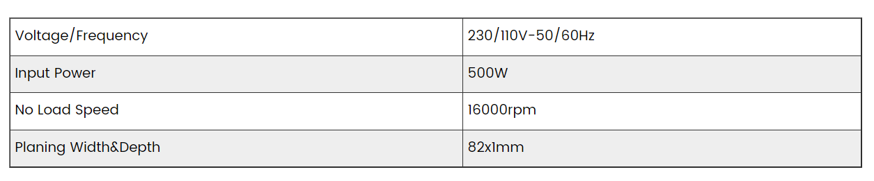La Ningbo Guininsky Company vende attualmente due stili di pialla elettrica. La tensione/frequenza della prima pialla elettrica EP002 è di 230/110 V - 50/60Hz, potenza di ingresso 500 W, rotazione a gusto a carico La velocità raggiunge i 16000 giri/min e la larghezza e la profondità della pialla sono 82x1mm. La parte ruvida della superficie del legno può essere rapidamente trattata per renderla liscia e piatta. Puoi anche regolare l'angolo della lama del prodotto, usarlo come smussatura e scanalatura e fare smussi e scanalature. La tensione/frequenza della pialla elettrica EP023 è inoltre 230/110 V - 50/60Hz, la potenza di ingresso è aumentata a 600 W, la velocità di non carico è di 15000 giri/min e la larghezza e la profondità della pialla sono 82x2mm. Il prodotto adotta un corpo in lega di alluminio, che può far fronte a più operazioni di lavorazione del legno. Ci sono alcune differenze tra i due. Ad esempio, il corpo in lega di alluminio EP023 ha una migliore dissipazione e durata del calore rispetto all'EP002, quindi sarà più utile in progetti più pesanti e a lungo termine. Allo stesso tempo, EP002 è più portatile, più vantaggioso nel prezzo e relativamente conveniente. È adatto per un lavoro di carpenteria meno pesante e un uso personale fai -da -te familiare.