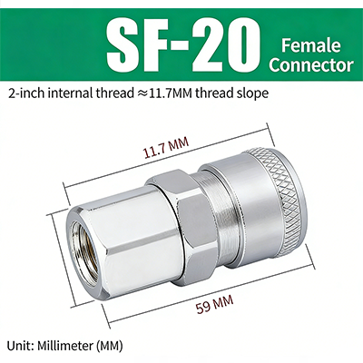 1.SF-20. La filettatura del tubo imperiale è G1/4", il diametro della parte filettata è di circa 11,7 mm e la lunghezza totale del prodotto è di 59 mm.