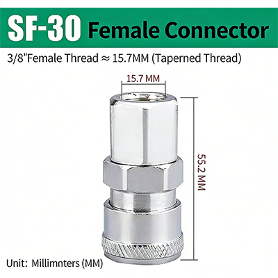 2.SF-30. Filettatura interna da 3/8 pollici, il diametro della parte filettata è di circa 15,7 mm e la lunghezza del prodotto è di 55,2 mm.