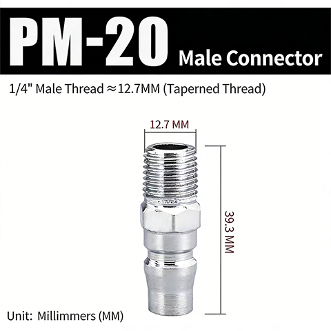 1. PM-20. La filettatura esterna da 1/4 di pollice è una struttura conica della filettatura esterna. Il diametro della parte filettata è di 12,7 mm e la lunghezza totale del prodotto è di 39,3 mm.