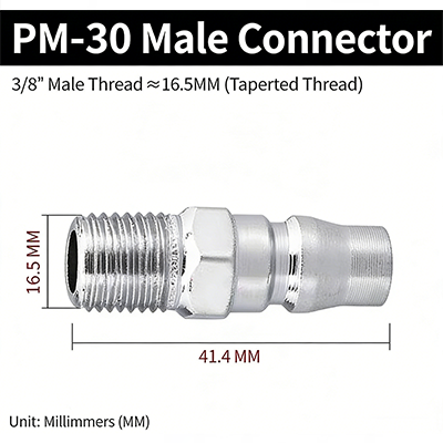 2. PM-30. La filettatura maschio da 3/8 pollici è una struttura conica della filettatura esterna. Diametro del filo: 16,5 mm e la lunghezza complessiva è 41,4 mm.
