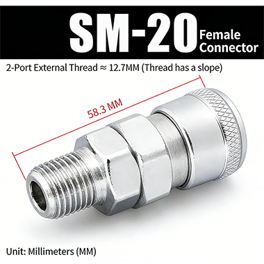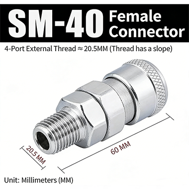 3.SM-40. La filettatura esterna da 1/2 pollice è una filettatura conica con un diametro della filettatura di 20,5 mm e una lunghezza complessiva di 60 mm.