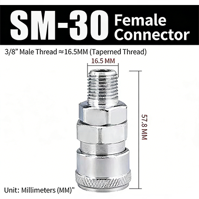2. SM-30. La filettatura maschio da 3/8 pollici è una struttura conica della filettatura esterna con un diametro della filettatura di 16,5 mm e una lunghezza complessiva di 57,8 mm.
