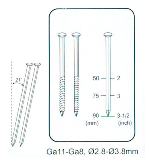 Le specifiche per unghie sono GA11-GA8, con diametro 2,8-3,8 mm e lunghezze in genere da 50 mm, 75 mm e 90 mm (2 pollici, 3 pollici, 3-1/2 pollici). L'angolo di inclinazione della disposizione delle unghie è di 21 gradi. La profondità delle unghie può essere regolata in base alle esigenze di lavoro.