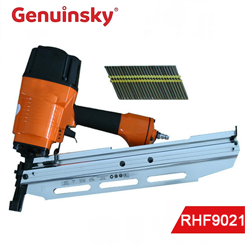 RHF9021 Round Framing Nailder è una pistola pneumatica professionale sviluppata e prodotta da Ningbo Guininsky. Il corpo in chiodo è realizzato in fuste di alluminio, leggero, alta tenacia, pistone grande e forza forte. Sulla base dell'esperienza utente reale, il prodotto è stato aggiornato per venire con un sistema di scarico a 360 gradi per evitare che la polvere voli in giro. La struttura della sicurezza del contatto dell'ugello protegge la sicurezza del lavoro. La bocca della pistola per unghie è dotata di una copertura protettiva in gomma, che non danneggia la superficie di lavoro. Il prodotto utilizza un pistone integrato internamente, che ha una buona qualità, alta efficienza, può inchiodare continuamente e rapidamente e ha una lunga durata di servizio.